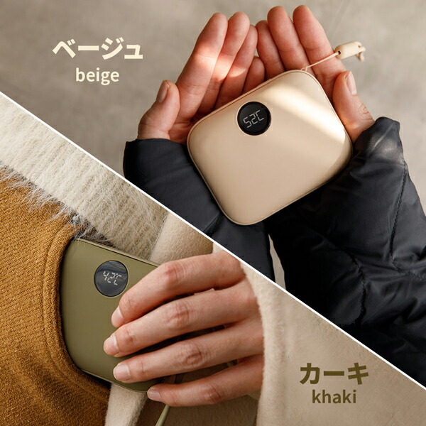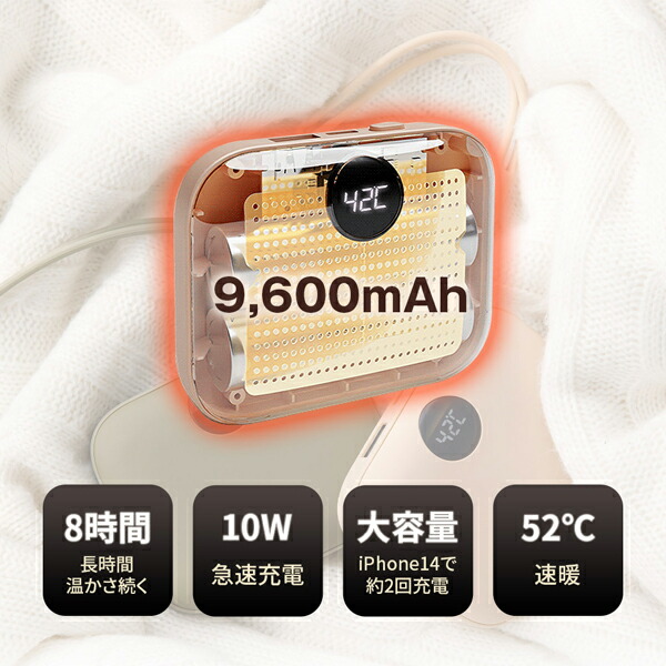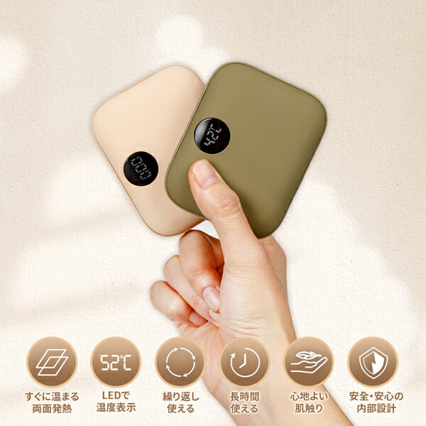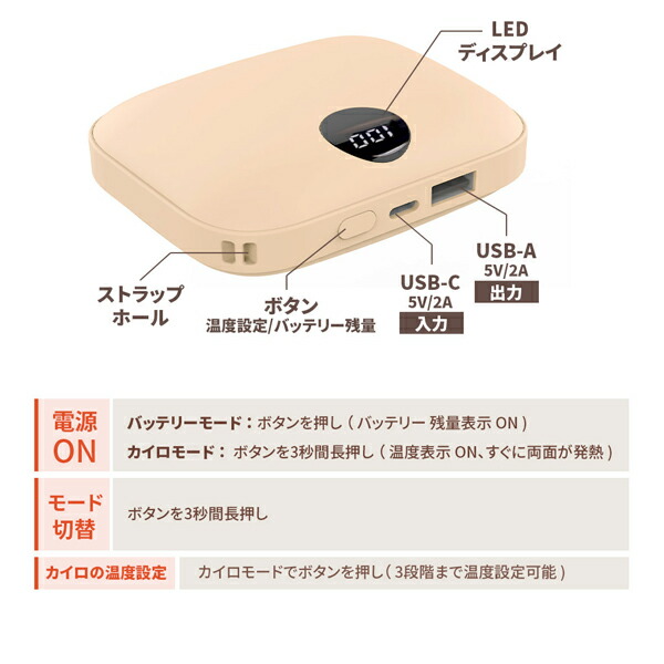 10秒で速暖、両面が素早く温まります。外出時に便利なモバイルバッテリーを搭載しており通年して使用できます。安全面にもこだわり、安心して使えるスマート温活グッズです。 【USB充電式カイロにモバイルバッテリー機能付き】 繰り返して使える充電式カイロにモバイルバッテリー機能を搭載しており、1年を通して使用可能です。 必要な時に必要な温度で温められるので、冬季や寒冷地での使用に最適です。 カイロとモバイルバッテリーのモード切り替えにより、USB-A充電ポートからスマホなどデバイスに簡単に充電できます。 ※ カイロ機能とモバイルバッテリー機能の同時使用はできません。 【8時間も温かさが続く、大容量バッテリーを搭載】 ポケットサイズに大容量バッテリーを搭載し、最大約8時間の連続使用が可能です。 バッテリー容量は9,600mAhで、iPhone14を約2回分程度、充電できます。(最大出力10W) ※ 環境温度10℃、42℃モードでの連続使用時間 ※モード切り替えを繰り返すなど使用環境により、使用可能時間が短くなる場合があります。 【ワンタッチ操作、3段階の温度設定】 低(42℃)-中(47℃)-高(52℃)の3段階で温度設定可能。ワンタッチで設定温度を切り替えることができます。 【ひと目でわかる温度・バッテリー残量のLED表示】 LEDディスプレイで設定温度やバッテリー残量を簡単に確認できます。 【10秒速暖、素早く両面あったか】 3秒間の長押しでカイロモードになり、すぐに両面が発熱します。 最大52℃まで発熱し、適度な温度で温められるので、冬季や寒冷地での使用に最適です。 ※寒冷地など、使用環境によって早く温まらない場合があります。その場合は高(52℃)に設定し、一度温まった状態から最適な温度に変更してください。 【心地よい手触り、片手で持ちやすい】 暖かさを逃さないようにラバーコーティングで表面を特殊処理しています。発熱していない状態でも冷たさを感じづらい触感です。温まった時はより心地よい手触りを体験していただけます。片手で持ちやすく、ポケットやカバンに入れてもかさばらないコンパクトデザインです。 |