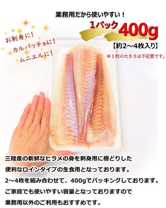 ヒラメ 刺身用 平目 鮃 宮城県産 天然 ひらめ ロイン 柵どり 生食用 冷凍 400g(2〜4枚入)鮃・ヒラメロイン・