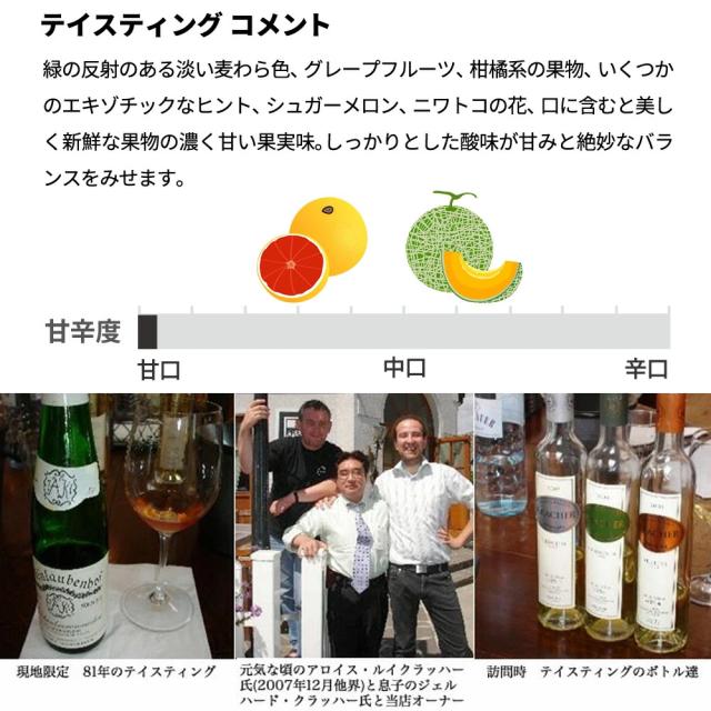 2007年に働き盛りで急逝した先代のアロイス・クラッハー氏は冷静に、「自分は非常に恵まれているだけ。父親の努力が土台となり、また高級甘口ワインに対する感心が世界的にみて今までになく高かったから。」と語っておりました。 父・アロイスの後を継いだゲオハルト・クラッハー氏は、「世界的に有名なワイナリー」というプレッシャーのなか、叔父・ルイス(畑の管理)と母・ミハエラ(事務担当)とともに、最高級のワインを造るため努力をしています。2008年に来日し、大使館での試飲会を開催するなど、奮闘中です 。
