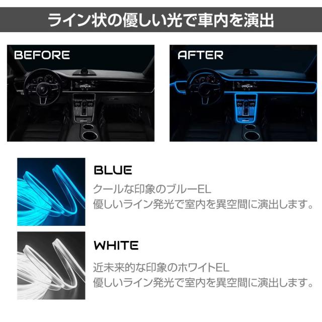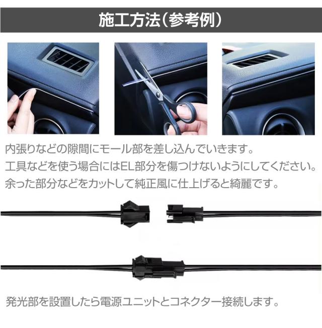 ELラインライトのやさしい光で車内を演出。 フィン形状になっているので内張りの隙間に挿し込み易い! お好みの場所で自由にカット可能! |
