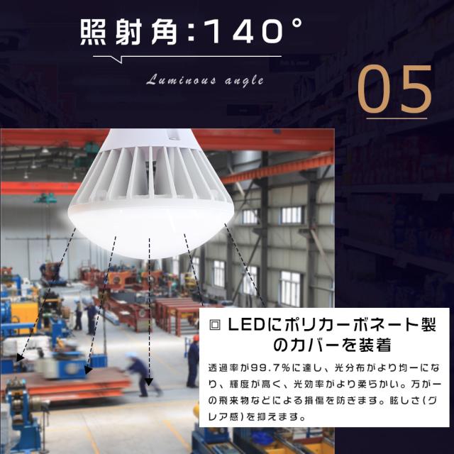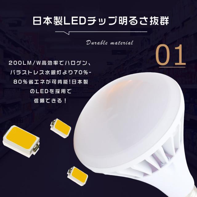 ★業界最高レベルの発光効率200lm/Wを実現し、他社の200W 16000lm 80lm/W製品に比べて50%の省エネを実現。明るさは1000Wバラストレス水銀ランプ相当で、全光束20000lmを誇ります。日本製LEDチップを搭載し、高い品質と性能を提供します。