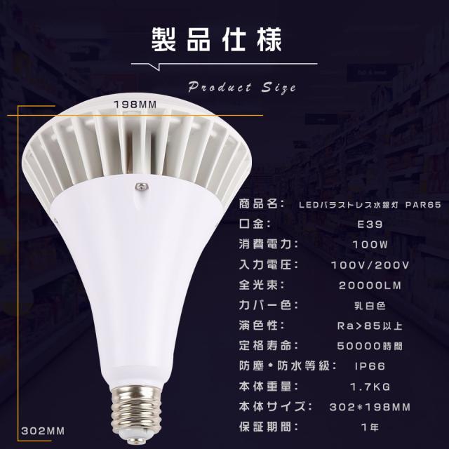 ≪50個入り≫バラストレス水銀灯 LED E39 LEDビーム電球 E39 LED水銀ランプ 水銀灯からLEDへ交換 PAR65 E39口金 LEDレフ電球 レフランプ LED パラストレス水銀灯代替用 LED投光器 屋外用 防水 看板灯 街路灯 1000W相当 IP66防水 屋内屋外兼用 100W 20000lm 100V/200Vに対応