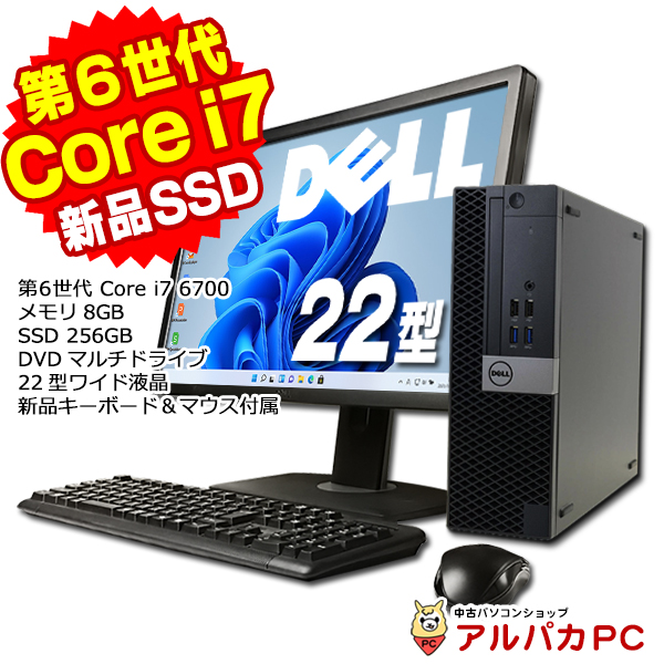 【AIかんたんPC】デスクトップパソコン 中古 22型ワイド液晶セット Windows11 DELL Optiplex 7040 SFF 第6世代 Core i7 6700 メモリ8GB SSD256GB DVDマルチ Windows11 Pro Office付き