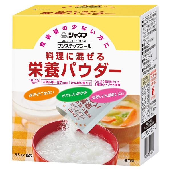 「ワンステップミール 料理に混ぜる栄養パウダー」は、エネルギーとたんぱく質摂取を同時にサポートする栄養補給食品です。加熱しても凝集しないので、さまざまな料理にご利用いただけます。