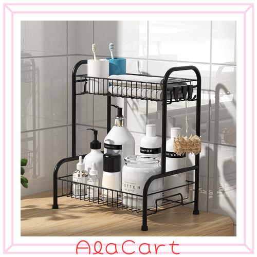 省スペース:下段と上段がある2段のシャンプラックは、小物が掛けられる便利なフック3つ付きます。下段と上段の間の高さが十分あるんのでシャンプーボトルや洗面用具が取り出しやすいです。 商品の落下を防ぐためにエッジが高くなっています。