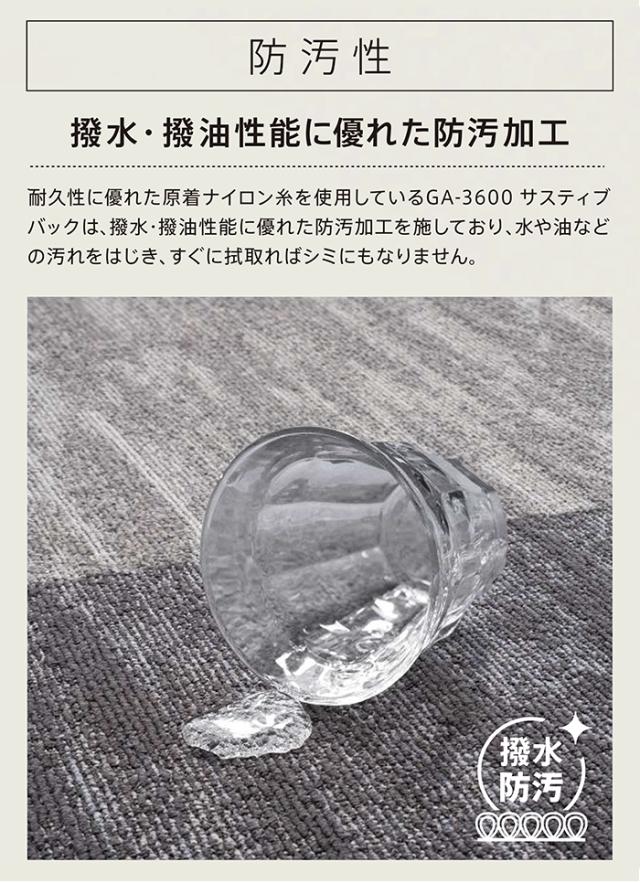 撥水・撥油性能に優れた防汚加工を施したタイルカーペットです。