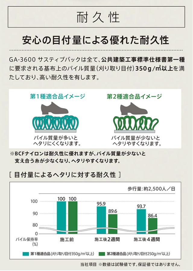 公共建築工事標準仕様書第一種に要求される基布上のパイル質量(刈り取り目付)350g/平米以上を満たしており、高い耐久性を有します。