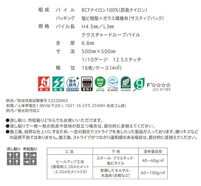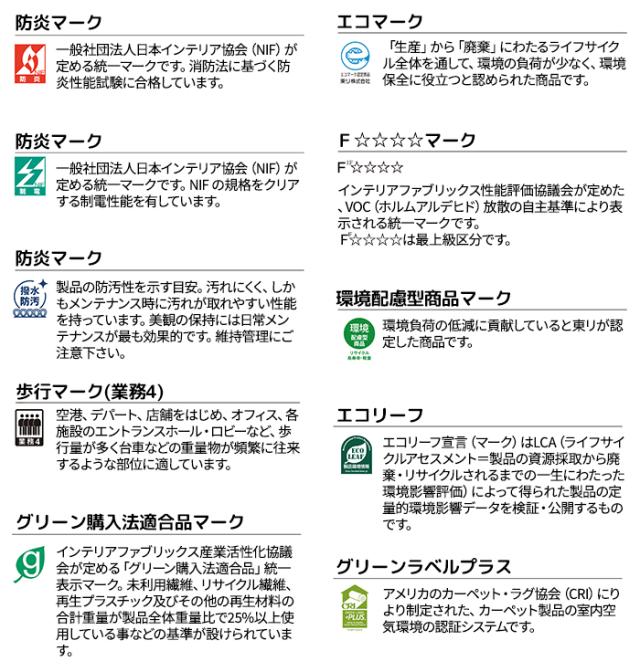 ◆機能:防炎、制電、撥水、防汚、高耐久、土足OK、環境配慮型商品、エコマーク、エコリーフ、グリーン購入法適合品、ホルムアルデヒド対策品