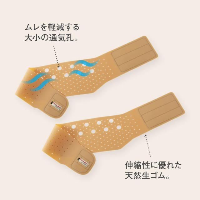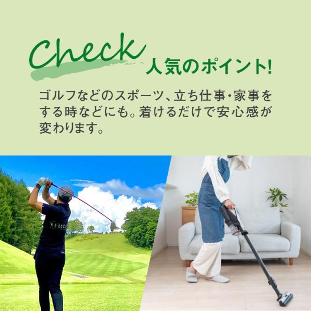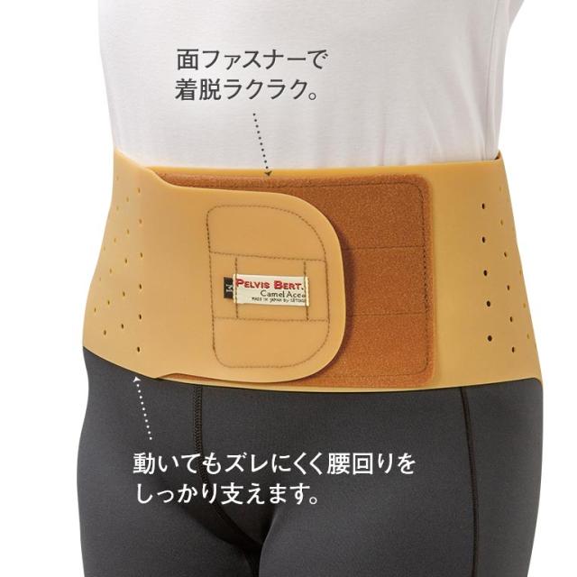 伸縮性に優れた天然生ゴムの幅広ベルトが体にぴったりフィット。動いてもズレにくく腰回りをしっかり支えます。締め具合は面ファスナーによりお好みで調整できます。
