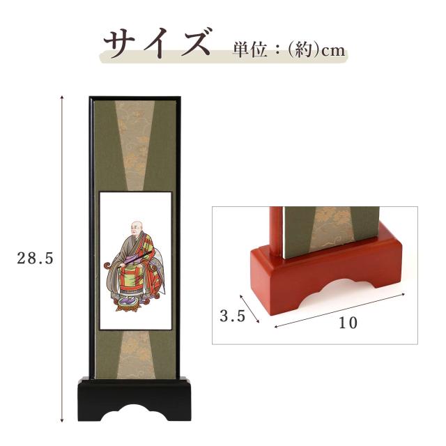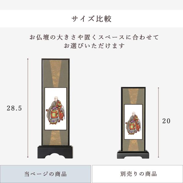仏壇の上段中央に祀る本尊と両脇に祀る脇掛けとしてお祀りいただきます。中型仏壇・大型仏壇に合う大きさとなっております。お安く、しっかりとしたスタンド型をお探しの方にお勧め。