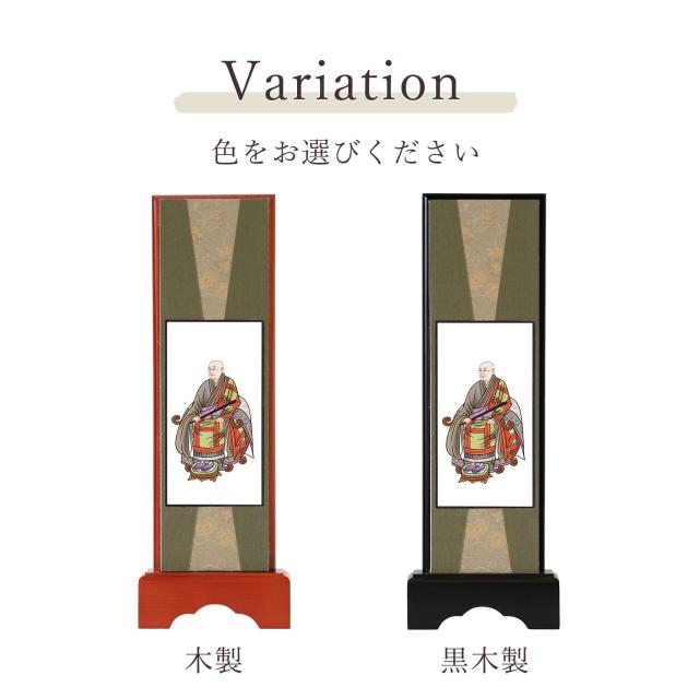 木製スタンド型の掛軸となっております。本紙に描かれる繊細な絵像は和紙の縁取り、厳かな配色。お仏壇に置くだけで簡単に設置できるタイプです。