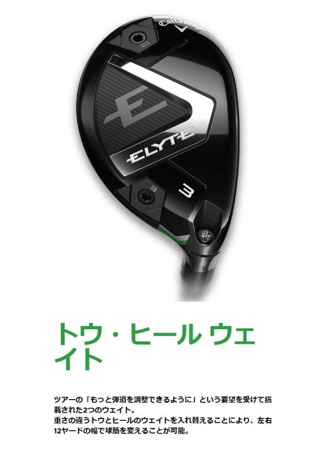 ユーティリティは、フェアウェイウッドとアイアンの間を繋ぐ位置づけで、アイアンでは安定して出せない飛距離を、高い精度で実現できるように助けてくれるカテゴリーです。「ELYTE」のユーティリティでは、その特徴を考慮し、より個々のプレーヤーが自信を持って打っていけるよう、フィッティングの幅を広げました。その1つが、ソール後方のトウとヒールに設置された台形型のウェイトです。とくにアメリカのLPGAプレーヤーから、「もっとユーティリティの弾道を調整できるようにしてほしい」という声があったことで採用されたもので、トウとヒールのウェイトを入れ替えることにより、左右約12ヤードの幅で球筋を変えることができます。
