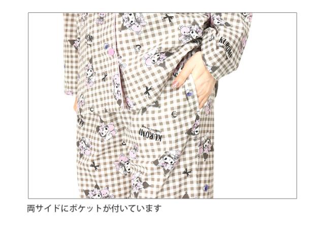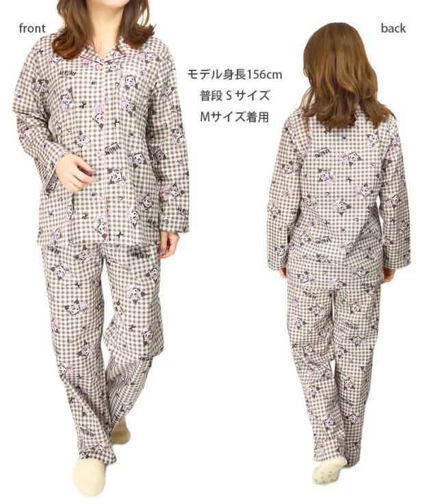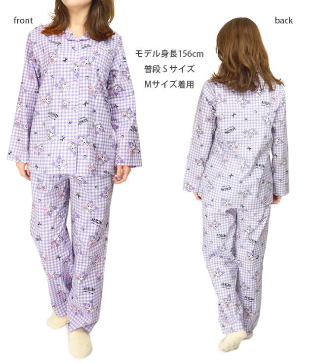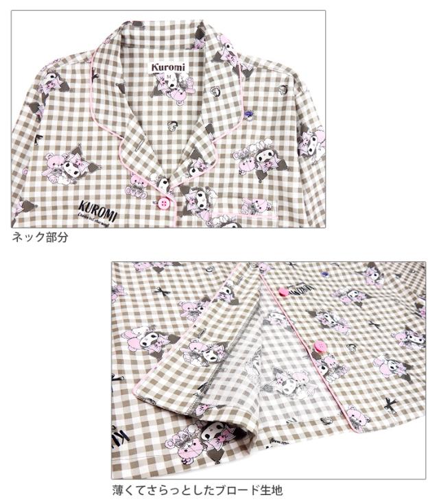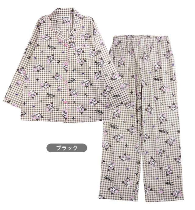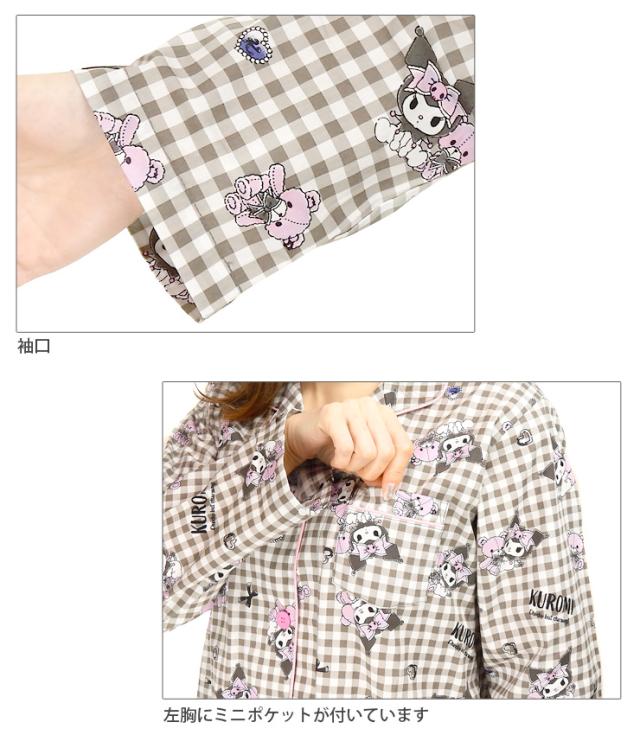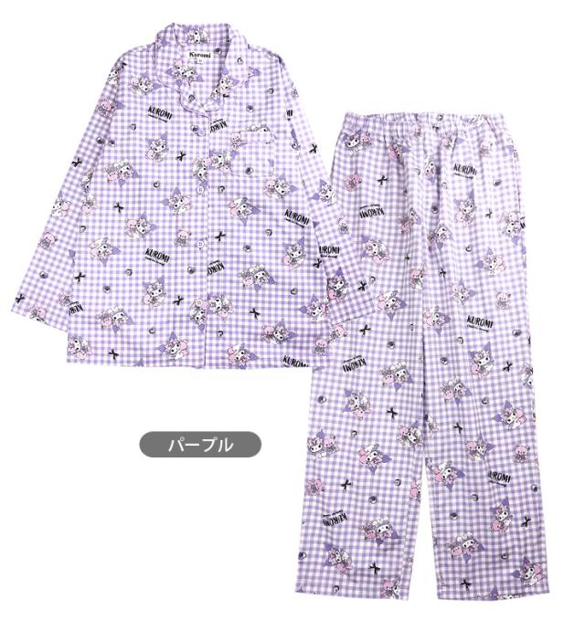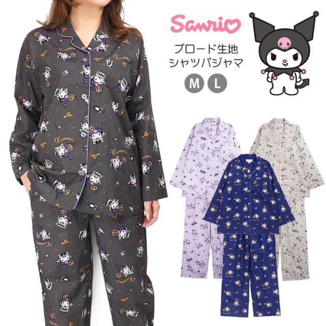 【メール便送料無料】サンリオ クロミ 前開き 長袖 シャツパジャマ 上下セット レディース 秋春 ブラック パープル ネイビー M L SAN-1782 SAN-1902 Sanrio Kuromi 綿100% ルームウェア 前ボタン 長ズボン ロングパンツ キャラクター ギンガムチェック クイーン 黒 紺 2800