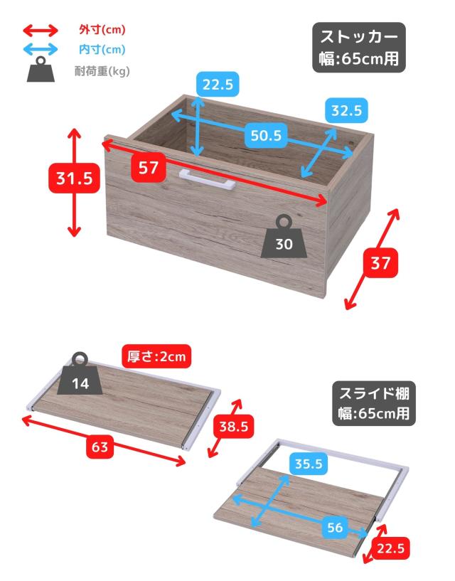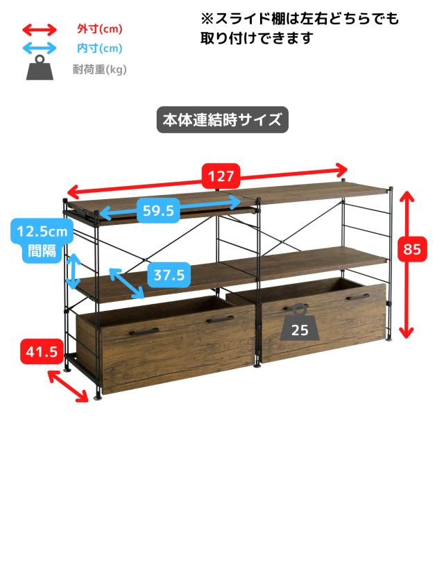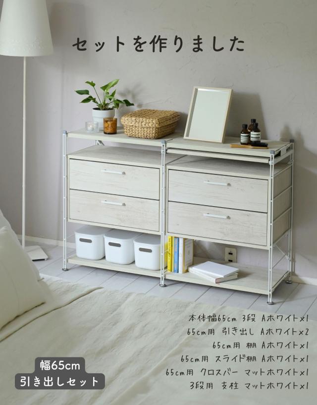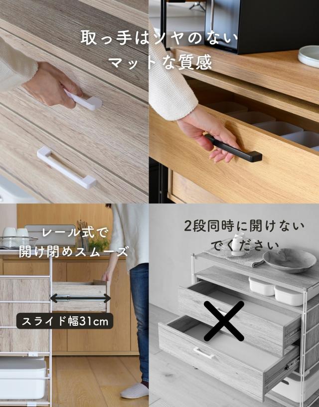 | 商品説明 | ●【取り付け時の注意事項】 ※重い商品ですので、必ず2人以上で設置してください。 ※本体フレームの桟、下から4段目までの間に引き出しのフックを引っかけてください。 ※クロスバーと重なる位置には取り付け付けづらい場合があります。 ※引き出しを2段同時に引き出さないでください。 ※キャスターと併用はできません。 ●幅85.5cmのウッドシェルフ本体とオプションパーツを合わせたセット 【セット内容】 ウッドシェルフ本体×1 2段引き出し×2 スライド棚×1 棚×1 クロスバー×1 支柱×1 【ウッドシェルフ本体】 ●モノに合わせて棚の位置を変えられる木製棚板のスチールラック ●インボックスなど収納ボックスが縦にすっぽり収まるサイズ設計 ●棚板は木の質感があってお手入れもかんたんな、合成樹脂化粧繊維板 ●軽くて強いフラッシュ構造で、1段あたり25kgの耐荷重 ●フックでフレームに引っ掛けるだけなので、位置の変更もかんたん 【2段引き出し】 ●レール式でスムーズな開閉 ●奥のものまで見やすいフルオープン式 ●カトラリー、食品、お皿、お鍋などが収納しやすいサイズ ●リビングや寝室で衣類や小物収納にも使える ●スライド幅:31cm(取っ手含む33cm) ●耐荷重: 天板10kg、引き出し1段当たり5kg ●サイズ: 幅80×奥行き37.5×高さ40.5cm 重量22.5kg ●内寸: 幅70.5×奥行き28×深さ11cm 【スライド棚】 ●レール式でスムーズな開閉 ●棚板の下に付けるとちょい置きできるトレーに ●木の質感があってお手入れもかんたん ●スライド幅: 22cm ●耐荷重: 14kg ●サイズ: 幅83.5×奥行き38.5×高さ2cm 重量5kg ●内寸: 幅76.5×奥行き33.5cm 【棚】 ●サイズ: 幅83.5×奥行き38.5×高さ2cm 重量5kg ●耐荷重:1段あたり25kg 【クロスバー】 ●サイズ: 92.5 重量0.6kg 【支柱】 ●サイズ: 幅2×奥行き40×高さ85cm 重量2kg |
