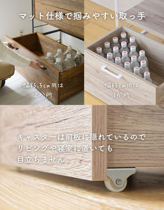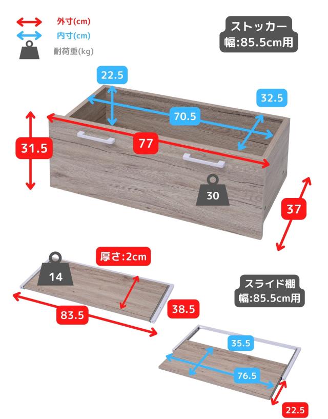 | 商品説明 | ●【取り付け時の注意事項】 ※2人以上ですと作業がしやすいです。 ※横揺れ軽減のため、付属のコの字バーを取り付けてください。 ※ストッカーのキャスターは一方向仕様です。 ※プラス、マイナスドライバーをご用意ください ※キャスターと併用はできません。 ※コの字バーは並列できません。段をずらして設置してください。 ●幅85.5cmのウッドシェルフ本体とオプションパーツを合わせたセット 【セット内容】 ウッドシェルフ本体×1 ストッカー+コの字バー×2 スライド棚×1 棚×1 クロスバー×1 支柱×1 【ウッドシェルフ本体】 ●モノに合わせて棚の位置を変えられる木製棚板のスチールラック ●インボックスなど収納ボックスが縦にすっぽり収まるサイズ設計 ●棚板は木の質感があってお手入れもかんたんな、合成樹脂化粧繊維板 ●軽くて強いフラッシュ構造で、1段あたり25kgの耐荷重 ●フックでフレームに引っ掛けるだけなので、位置の変更もかんたん 【ストッカー+コの字バー】 ●耐荷重30kgのしっかり設計 ●2Lのペットボトルが最大15本収納可能 ●カラフルなパッケージをしまえる深さで隠す収納をサポート ●正面から目立ちにくい隠しキャスター ●サイズ: 幅77×奥行き37×高さ31.5cm 重量12.5kg ●内寸:幅 70.5×奥行き32.5×深さ22.5cm 【スライド棚】 ●レール式でスムーズな開閉 ●棚板の下に付けるとちょい置きできるトレーに ●木の質感があってお手入れもかんたん ●スライド幅: 22cm ●耐荷重: 14kg ●サイズ: 幅83.5×奥行き38.5×高さ2cm 重量5kg ●内寸: 幅76.5×奥行き33.5cm 【棚】 ●サイズ: 幅83.5×奥行き38.5×高さ2cm 重量5kg ●耐荷重:1段あたり25kg 【クロスバー】 ●サイズ: 92.5 重量0.6kg 【支柱】 ●サイズ: 幅2×奥行き40×高さ85cm 重量2kg |