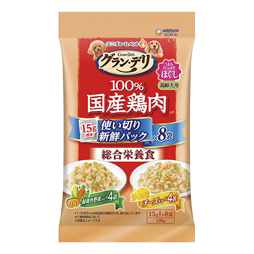 グランデリ 総合栄養食 国産鶏肉 パウチ 使い切りパック ほぐし 高齢犬用 緑黄色野菜&チーズ 15g×8袋