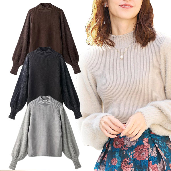 ぽわん袖のシャギーが大人かわいい、いつものニットよりも華やかに。普段のニットをこの「ぽわんシャギーニット」に変えるだけで、いつもとちょっと違う、大人かわいいコーデ完成。リブニットとシャギーの切り替えで、可愛くなりすぎないのがポイント。プチハイネック×伸びるニットで窮屈さなし。どんな服にも合わせやすい襟丈。手首は細リブで細見せ効果抜群。窮屈感のないニットでほどよく体にフィットします。カラーはブラック・グレー・ベージュ・ブラウンの4色からお選びいただけます。
