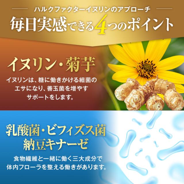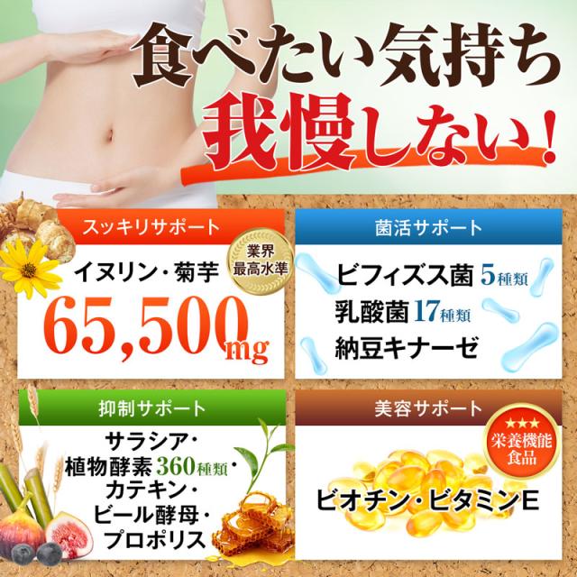 【4つのアプローチ】(1)『スッキリサポート』イヌリン・キクイモが内側からスッキリ、キレイに (2)『菌活サポート』乳酸菌・ビフィズス菌・ナットウキナーゼで体内フローラを整える (3)『抑制サポート』サラシア・植物酵素で余分なものをバリア (4)『美容サポート』ビオチン・ビタミンEでキレイの土台をサポート。