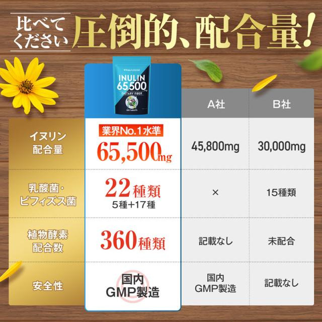 | イヌリン(タイ製造)、還元麦芽糖水飴、菊芋粉末、ミネラル酵母(ビオチン含有)、サラシアエキス末、納豆菌培養エキス末、殺菌乳酸菌粉末、デキストリン、植物発酵エキス末/セルロース、ステアリン酸Ca、微粒二酸化ケイ素、d-α-トコフェロール、(一部に乳成分・小麦・大豆・オレンジ・カシューナッツ・キウイフルーツ・ごま・バナナ・りんごを含む) |
