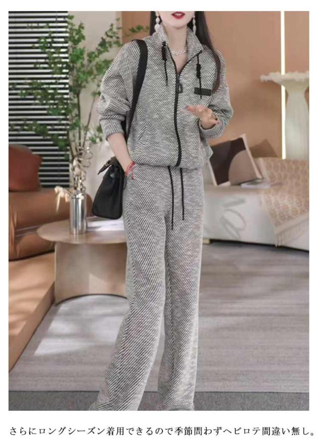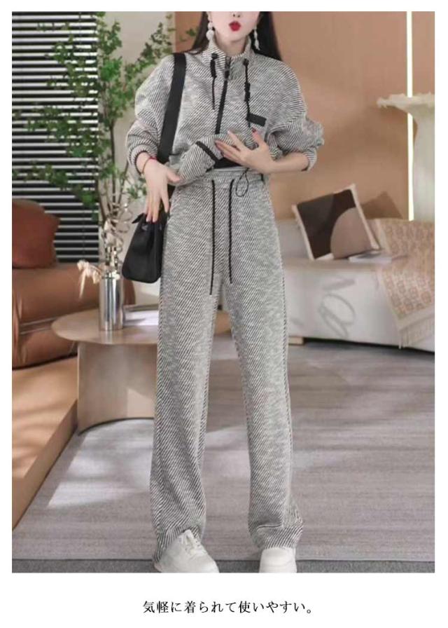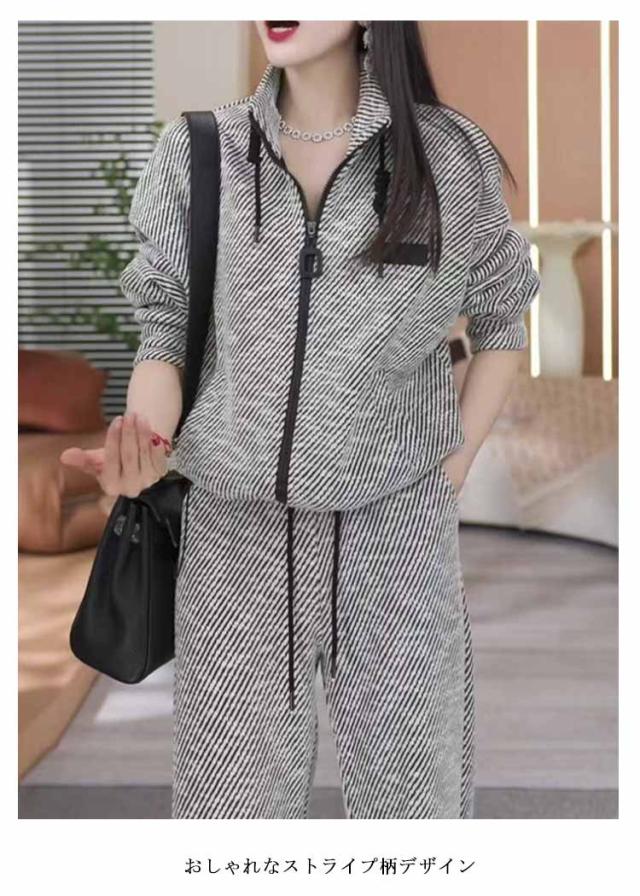 レディース パーカー ストライプ スポーツウェア スタンドカラー ワイドパンツ ジップアップ フードなし 上下セット セットアップ レディース ストレートパンツ ルームウェア おしゃれ 春 秋 冬 大人カジュアル