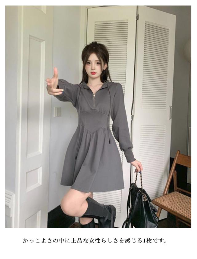 パーカーワンピース レディース 長袖 フード付き トレーナー スウェット ハーフジップ パーカー ミニワンピース ウエストシェイプ タック Aライン 楽ちん ショート丈 スウェットワンピース ブラック グレー