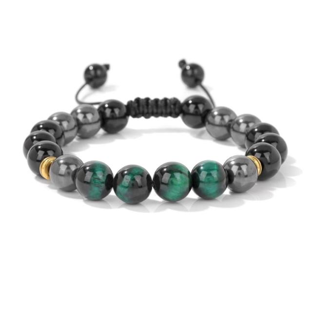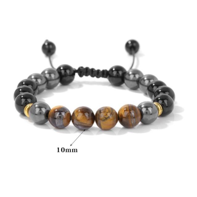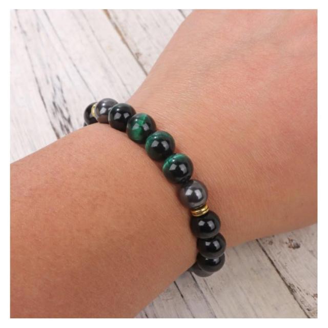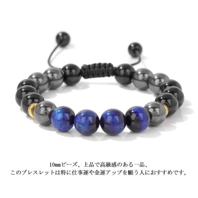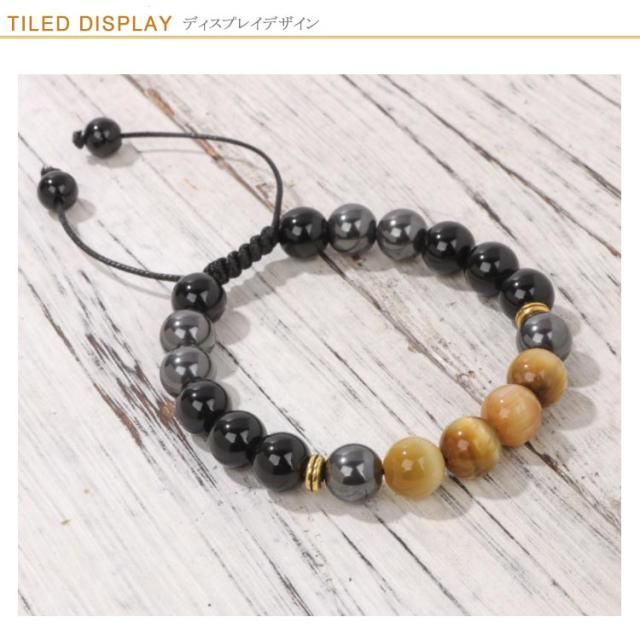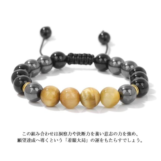 | 素敵なタイガーアイとヘマタイト、オニキスを組み合わせたブレスレット。 この組み合わせは洞察力や決断力を養い意志の力を強め、願望達成へ導くという「着眼大局」の運をもたらすでしょう。 10mmビーズ、上品で高級感のある一品、このブレスレットは特に仕事運や金運アップを願う人におすすめです。 サイズ調整できるから男性も女性もだれでもピッタリフィットし、おしゃれに付けることができます。 | |