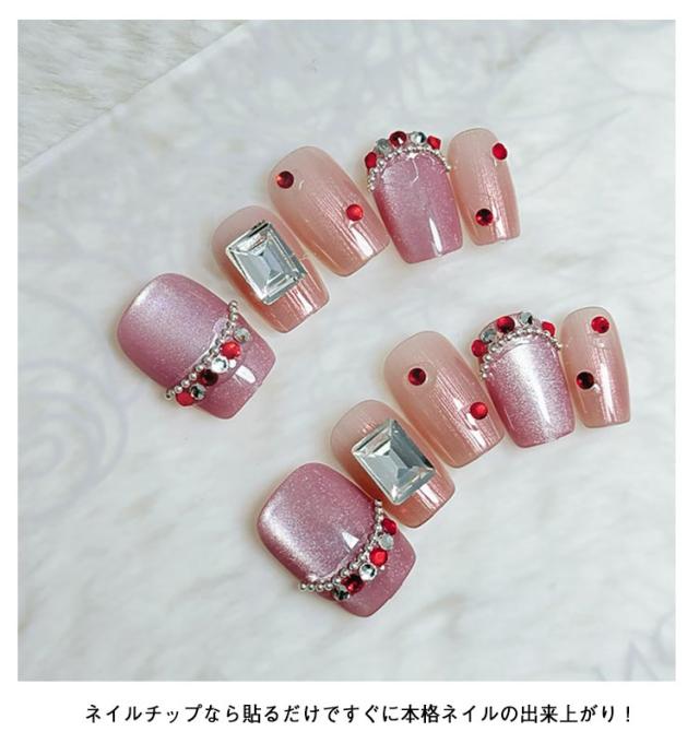 つけ爪 ネイルチップ キラキラ ピンク パープル ネイルチップ ショート丈 ストーン ネイル ネイル 簡単 セルフネイル ネイルチップ はがせる マグネット 貼るだけ ネイルステッカー オフィス 高級感 可愛い