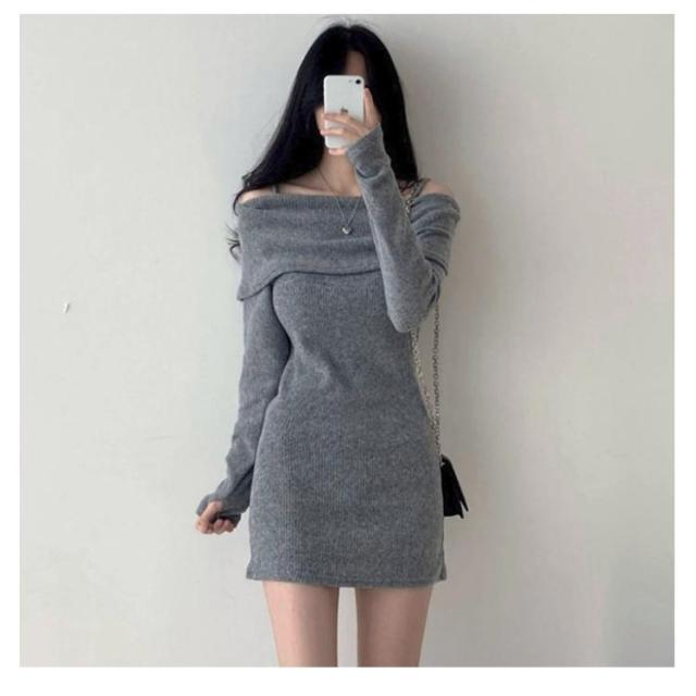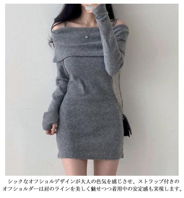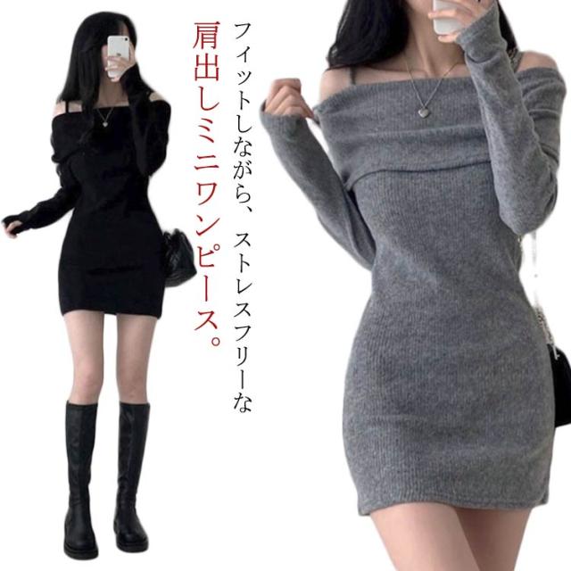 オフショルダー 肩出し チュニック丈 ワンピース キャミワンピース ワンピース 長袖ワンピ ワンピ リブ オフショルダー セクシー レディース 肩紐付き ニットソー 長袖 ワンピース 春ワンピース 秋ワンピース 指穴付き