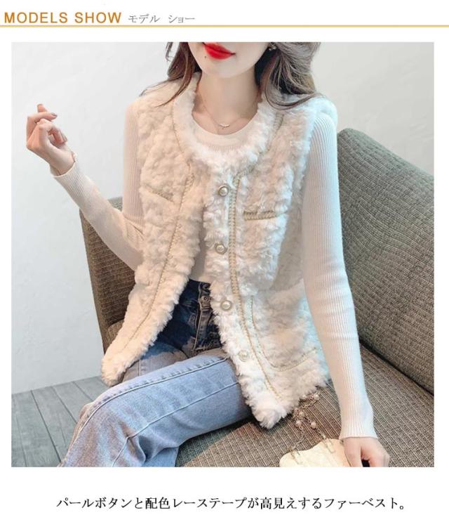 | 華やかで大人可愛い♪ パールボタンと配色レーステープが高見えするファーベスト。 もこもこふわふわ、柔らかな肌触りで、見た目も着心地も暖かいベスト。 女性らしい魅力と可愛さを演出でき、暖かさと防寒性も叶える大活躍の一枚です! 肌寒い日や室内の体温調節や、着こなしのアクセントにぴったりなベスト。 シャツワンピの上に羽織ったり、デニムと合わせたり、重ね着するアイテム次第でカジュアルもフェミニンスタイルも、幅広く楽しむ事が出来ます。 | |