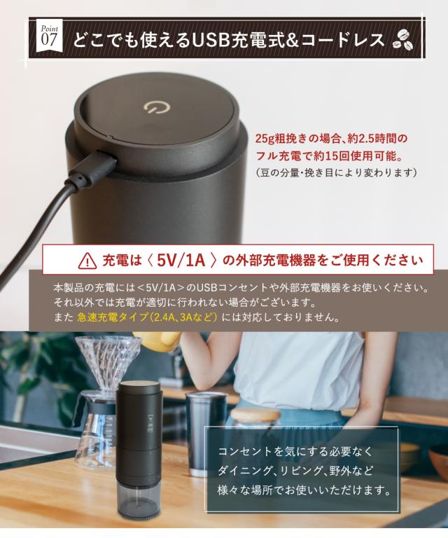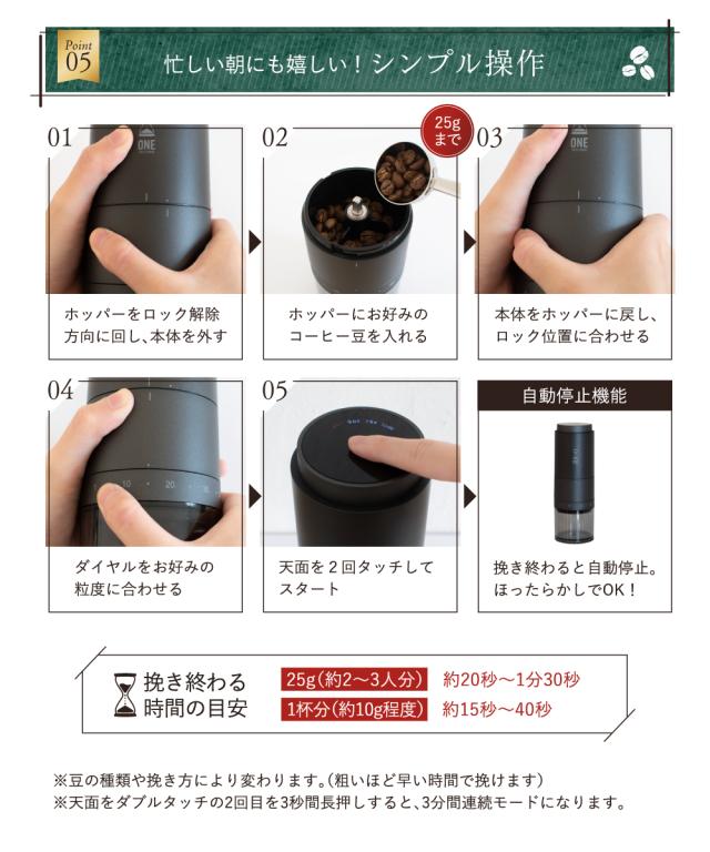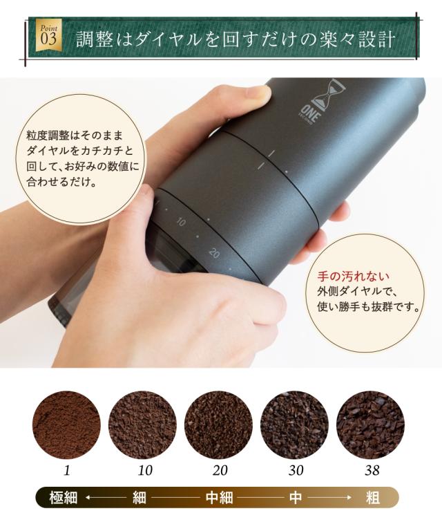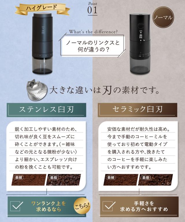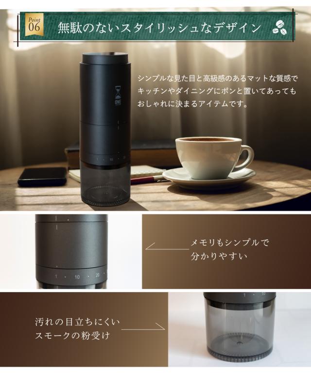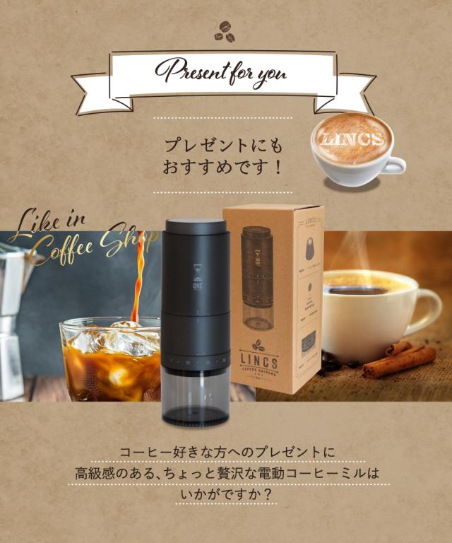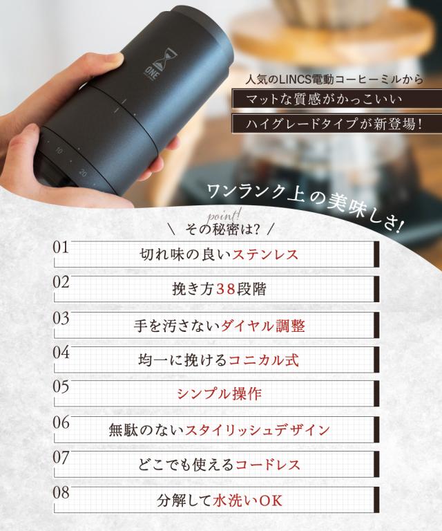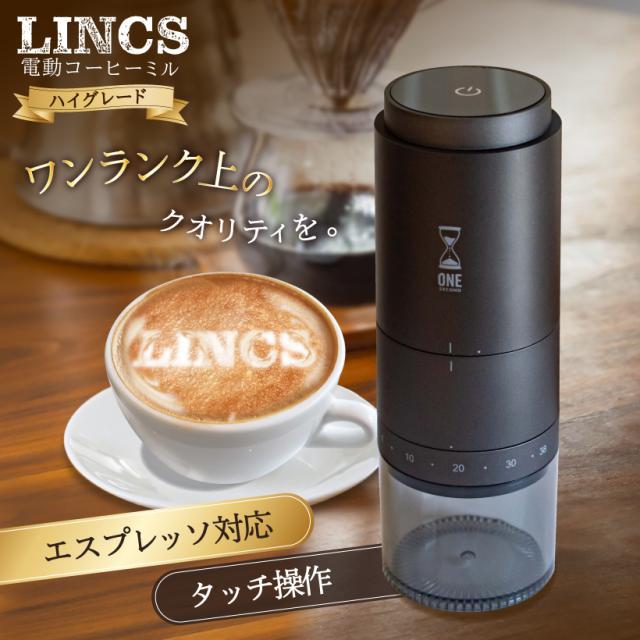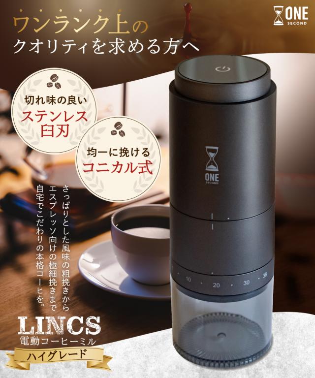 ONE SECOND 【特典付き♪ワンランク上の美味しさ】 コーヒーミル 電動 ステンレス刃 38段階 コニカル式 臼式 タッチ操作 コードレス 洗える 水洗い アウトドア 液晶 充電式 コンパクト 自動 珈琲 グラインダー 粗挽き 細挽き 珈琲豆 粒度調整 自動停止 電動コーヒーミル LINCS