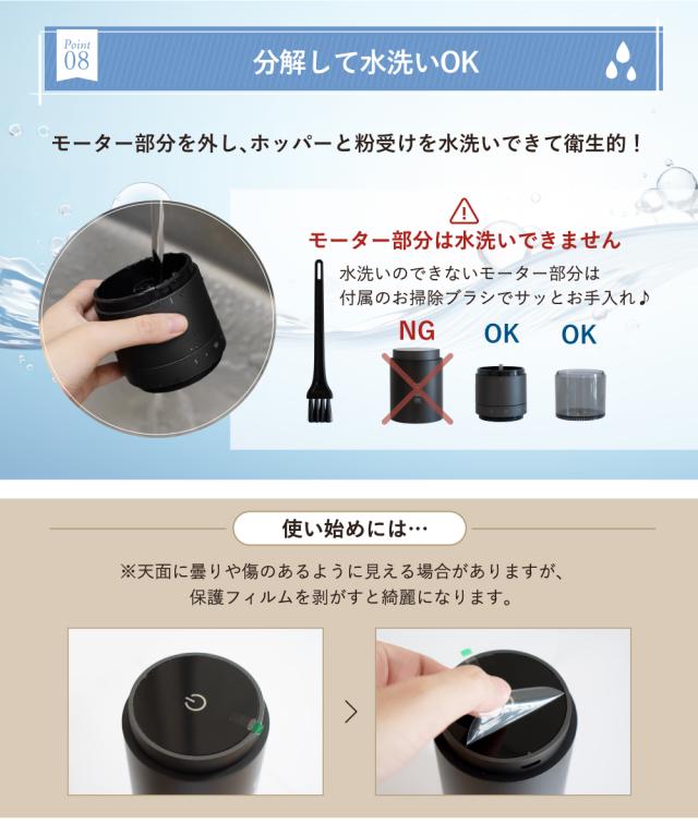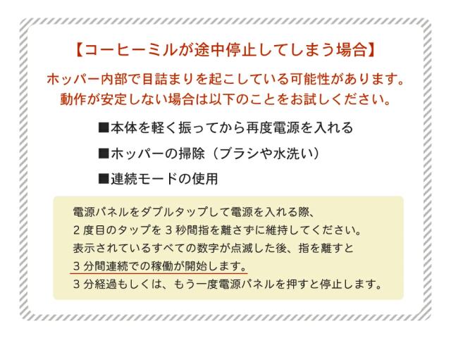 ※動作が途中停止する場合、ホッパー内部で目詰まりの可能性があります。次のことをお試しください。【本体を軽く振って再稼働】【ホッパーの掃除(ブラシや水洗い)】【3分連続モードの使用】=電源パネルの2度目のタップを離さず維持〜数字点滅後に指を離す