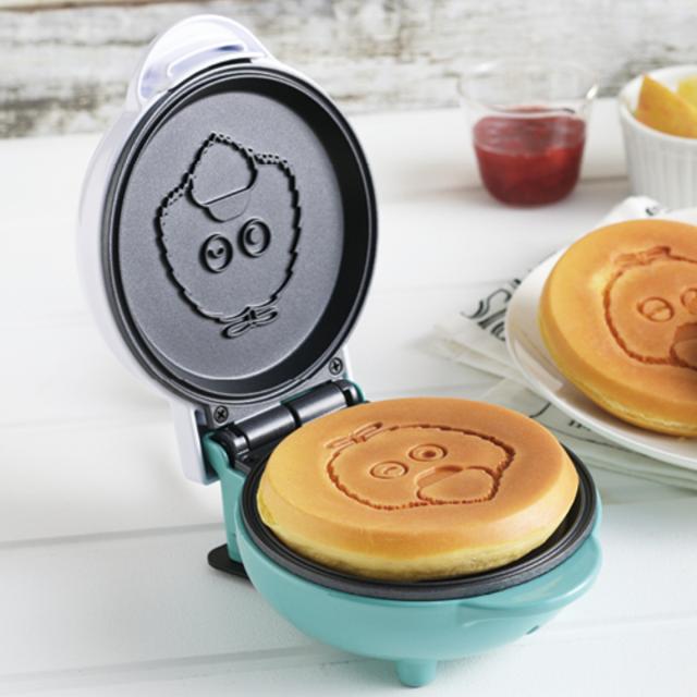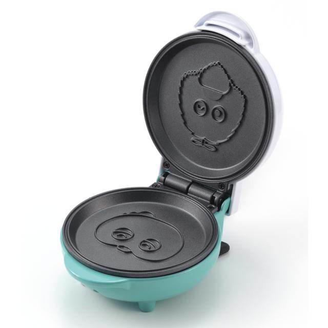 生地を入れて焼くとできあがり。焼き上がってふたを開けるとガチャピンとムックのお顔が焼き印されたパンケーキをお楽しみいただけます。おやつや朝食が楽しくなるキュートな仕上がりです。