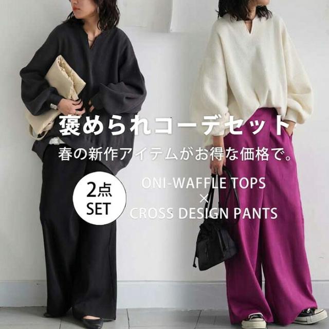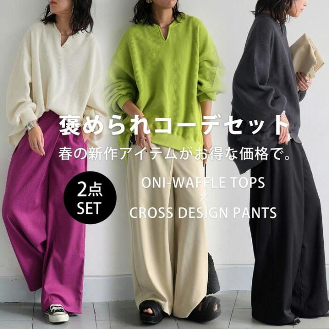 code-00035 トップス ボトムス 上下セット 長袖 無地 鬼ワッフル オニワッフル リブ クロスデザインパンツ ロング クロスデザイン ゆったり シンプル きれいめ 体型カバー 着痩せ 大きめ