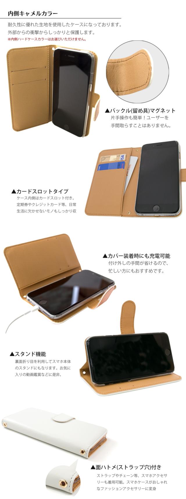 | 手帳型スマートフォンケース | 国内外で販売されているほとんどのスマートフォンに対応しています。 iPhoneだけでなくdocomo、au、softbankなどその他キャリアから発売されているAndroid系のスマートフォンにも使用できます。 PUレザーを使用した表面のカバーが液晶画面をキズから守り、鞄の中での誤発信も防止。 ベルトはマグネット式で片手でらくらく開けます。 内側には便利なカードポケット付き。小ポケット2個と大ポケットが1個付いているので、日常でよく使うカードや定期券など入れることができます。 ちょっとした身だしなみチェックに便利なミラー付きに変更することも可能。※選択肢よりお選びください。 動画視聴に便利なスタンド機能も搭載されています。 ストラップホールがついているので、キーホルダーやストラップなどをつけてショルダータイプのスマートフォンケースにすることもできます。 |