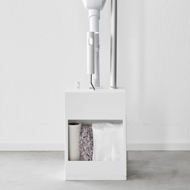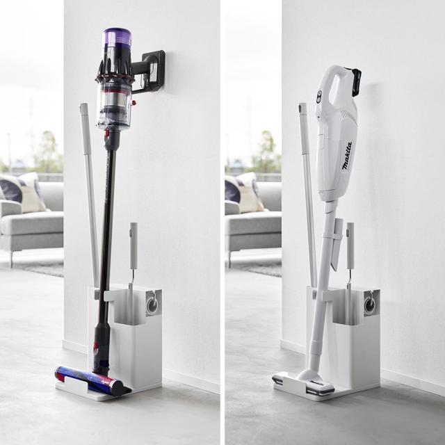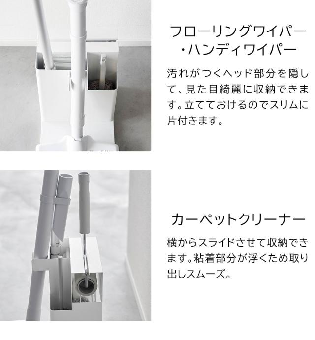 置き場所に困るお掃除グッズを隠して一括収納できるクリーナーツールオーガナイザーです。それぞれのお掃除ツールに収納スペースがあり、スティッククリーナー、フローリングワイパー、ハンディワイパーをスリムに立てて収納。カーペットクリーナーは横からスライドして入れるだけと出し入れもスムーズ。背面にはストックの収納スペースもあり便利です。生活感を感じさせないスタイリッシュでスリムなデザインで、リビングやお部屋の隅にすっきりと収まります。