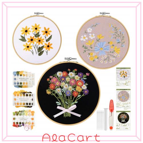 mefeny 刺繍キット 刺しゅう 初心者 パターンあり 英語と日本語ステッチ方説明書付き 3セット 竹製刺繍枠3本15CM/18CM/20CM 刺繍糸 刺繍