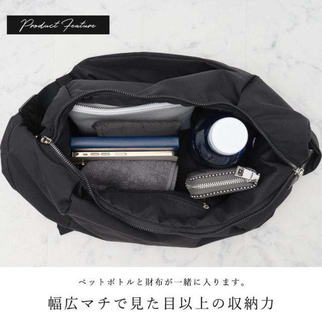 幅広デザインのショルダーベルトは、肩の負担にも優しく、長時間の持ち歩きが可能。