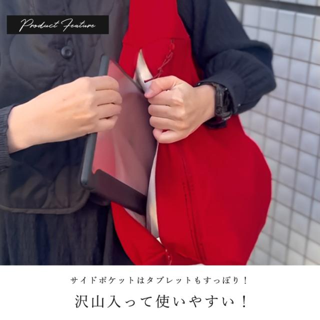 両サイドのファスナーポケットは幅広でタブレットなどの大きさの物を入れるのにおすすめです。