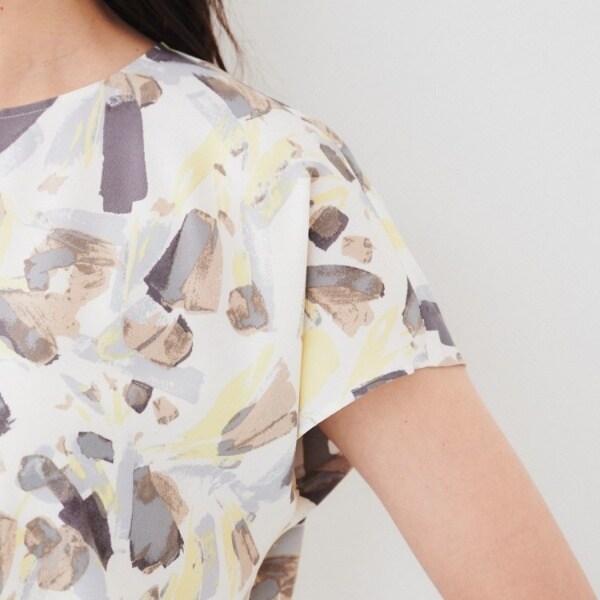 大胆なペイントパターンのプリントが目を惹くブラウス。