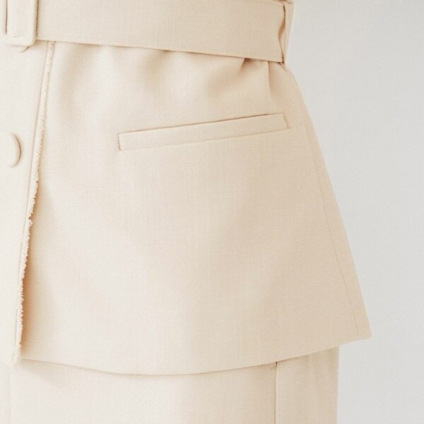 すっきりとしたフォルムに、共生地のフリンジとベルト、くるみボタンがアクセントになっています。