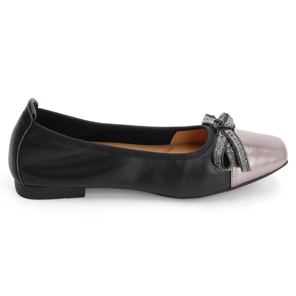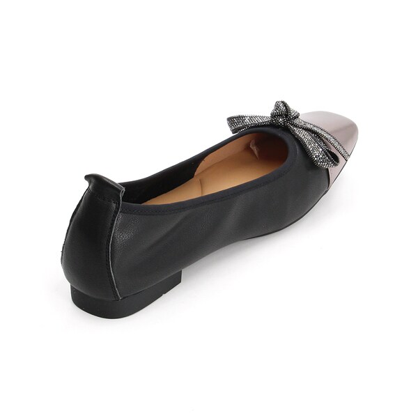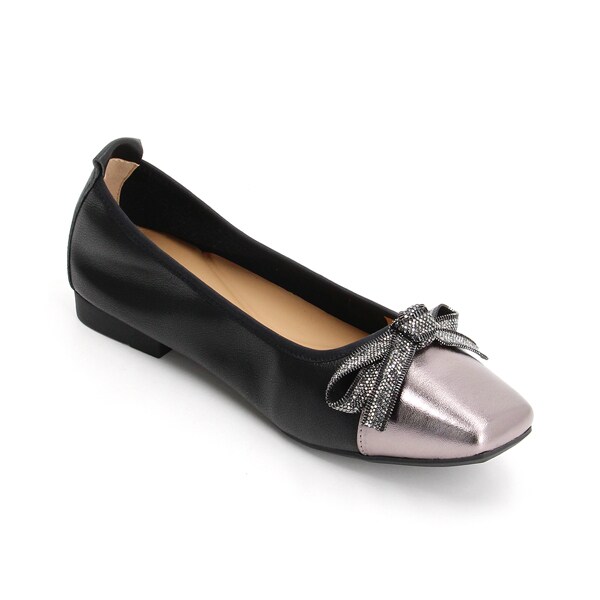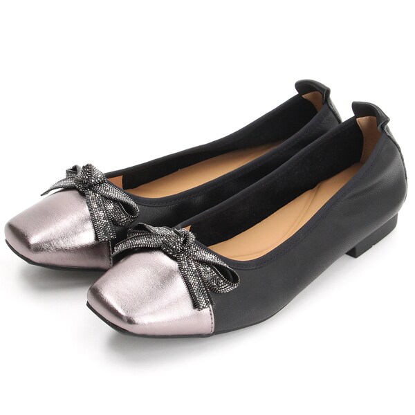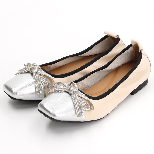大きめリボンにラインストーンを散りばめ、つま先部分のメタリック素材がエレガントでフェミニンな印象のパンプス。