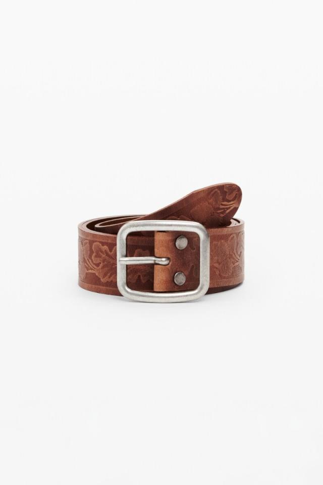 葉のモチーフがプリントされた本革製のベルト、バックル留め