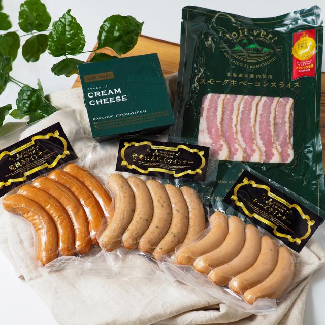 【数量・内容】クリームチーズ100g、荒挽きウインナー125g、行者にんにくウインナー125g、チーズウインナー125g、スモーク生ベーコンスライス90g