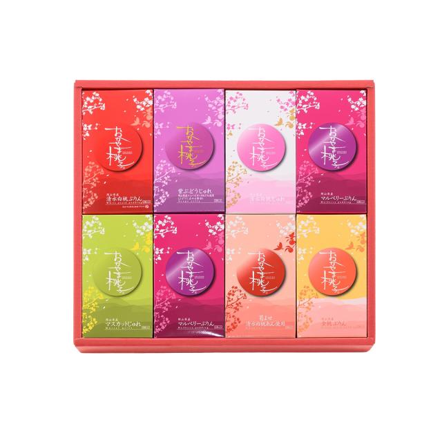 【数量・内容】40g×16(清水白桃ぷりん、清水白桃じゅれ、金桃ぷりん、清水白桃葛よせ、マスカットじゅれ、紫ぶどうじゅれ×各2個、桑の実ぷりん×各4個)