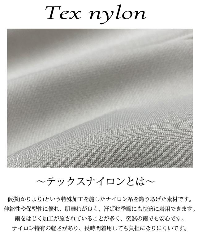 肌離れが良くドライなタッチが特長の新素材「テックスナイロン」を使ったイージージャケットの登場です。汗ばむ季節も快適に過ごしていただくことを目指して開発されました。【生地の特徴】仮撚(かりより)という特殊加工を施した軽量ナイロン糸をタテ、ヨコで太さを変えて使用。仮撚加工糸を使うことで生地に繊細なかさ高さが生まれ、着用した時のさらっとした肌離れの良い着心地をもたらします。合わせてしっかりとした伸縮性、保型性も兼ね備えたマルチファンクション素材です。