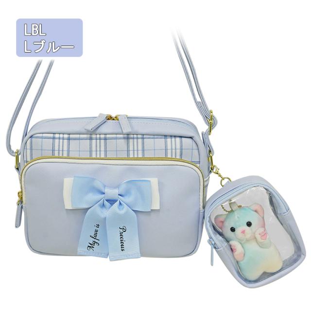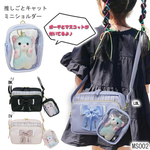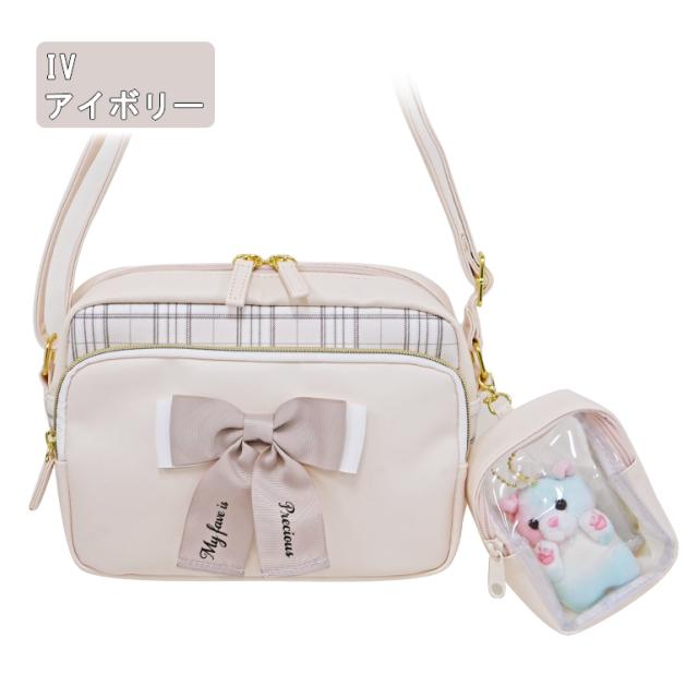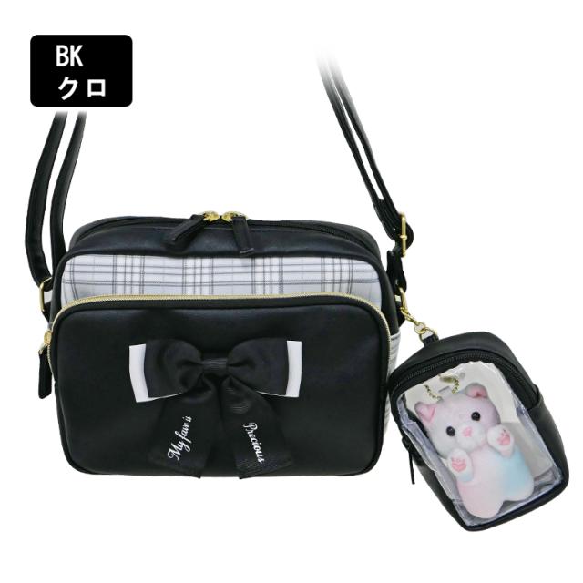 【セール】 バッグ ミニ ショルダー ぬいポーチ付 推し活 推し事 痛バ 斜め掛け リボン マスコット付 女子 小学生 軽量 軽い A5 クリア ポーチ 旅行 おでかけ デイリー 買い物 人気 お祝い ギフト プレゼント 誕生日 黒 可愛い グッズ 持ち運び チェック ヨコ型 角シボ MSO02
