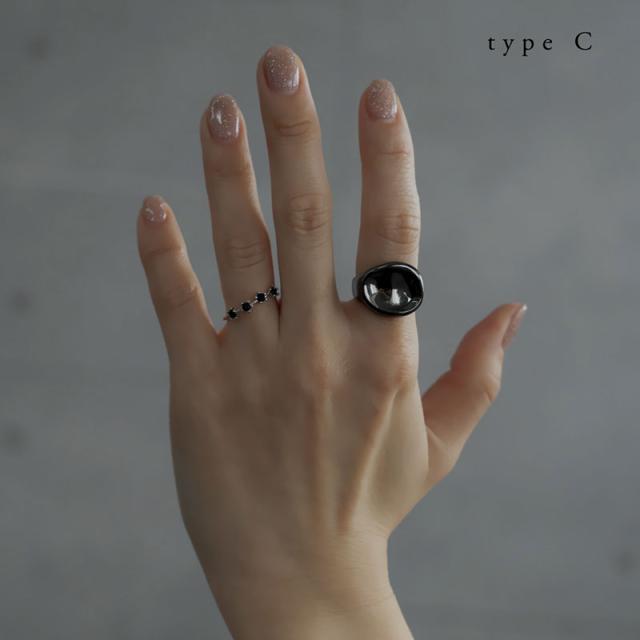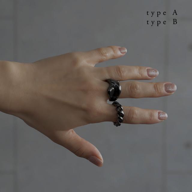 クールな表情が指先にアクセントを与えてくれるブラックメタルのリングです。