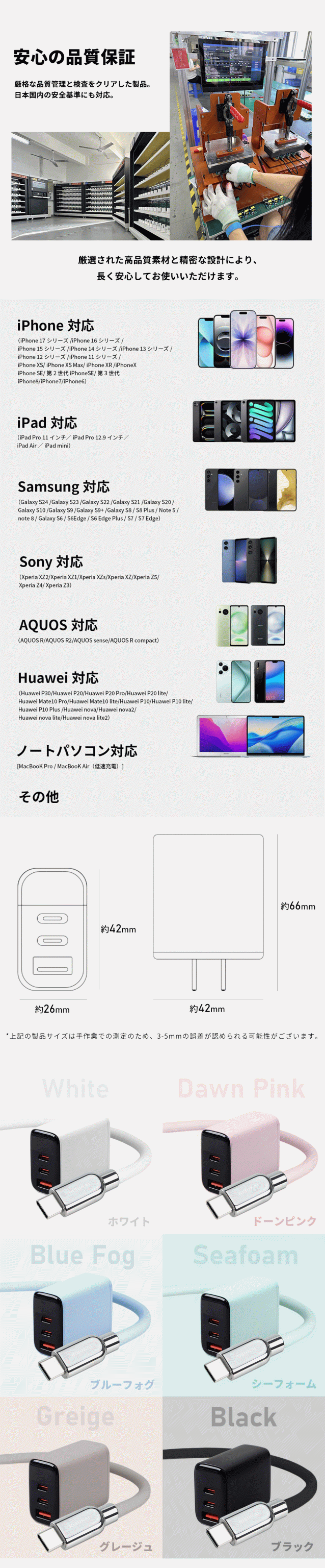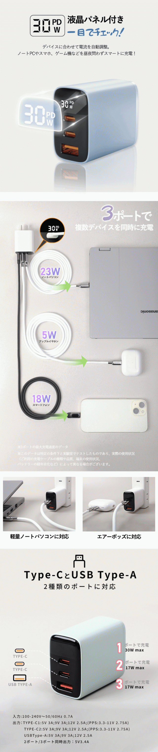 TYPE-C1出力:5V 3A;9V 3A;12V 2.5A;(PPS:3.3-11V 2.75A)