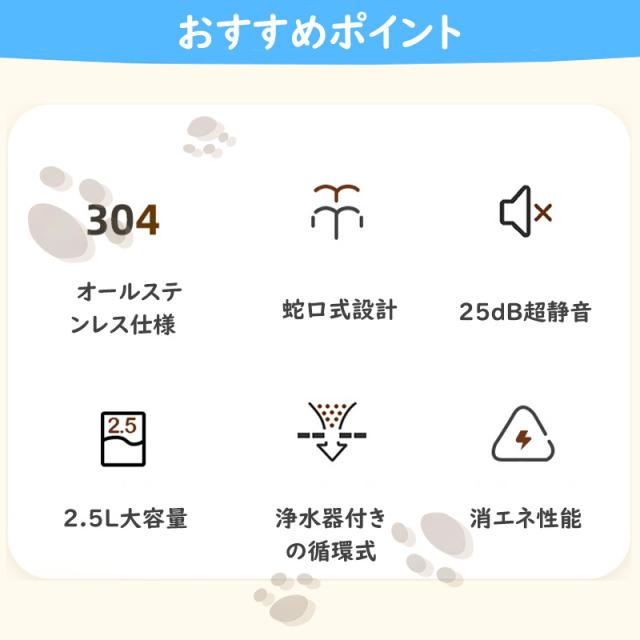 25dB以下の低圧超静音ポンプを搭載し、ペットも飼い主も夜間騒音を気にせず眠れる水飲み機です。