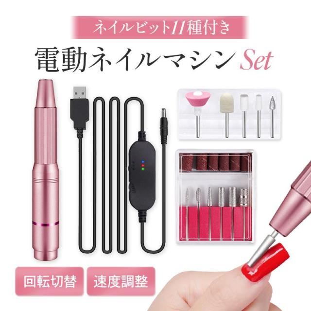 ネイルマシン 電動 プロ用 ジェルオフ 美容 家電 簡単 初心者 ケアセット 甘皮処理 角質除去 爪磨き 研磨 USB セルフ 自宅 軽い 正逆回転 ピンク